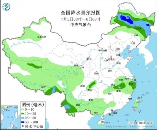 7月5日08時(shí)至6日08時(shí),內(nèi)蒙古東部、黑龍江中南部、吉林北部、云南西部和南部、江西北部、浙江北部等地部分地區(qū)有中到大雨,其中,內(nèi)蒙古東北部、黑龍江西南部等地局地有暴雨(50~80毫米)。內(nèi)蒙古、黑龍江、遼東半島、河北等地部分地區(qū)有4~6級風(fēng)。