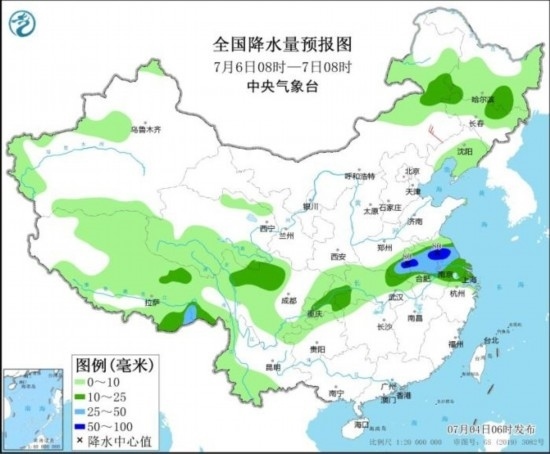 7月6日08時(shí)至7日08時(shí),內(nèi)蒙古東北部、黑龍江南部、吉林北部、西藏東部、川西高原北部、重慶、江淮大部、江南東北部等地部分地區(qū)有中到大雨,其中,河南東南部、蘇皖北部等地部分地區(qū)有暴雨(50~80毫米)。內(nèi)蒙古中部等地部分地區(qū)有4~5級風(fēng)。