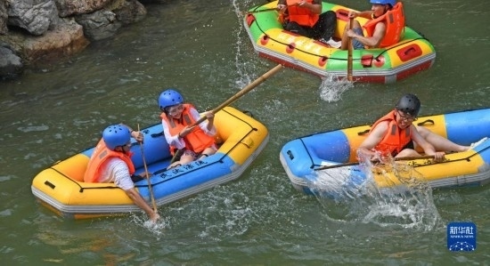 7月9日,游客在浙江省臺(tái)州市仙居縣仙騰峽漂流戲水。