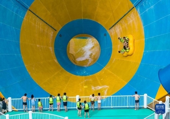 7月8日,游客在安徽省蕪湖市南陵縣大浦鄉(xiāng)村世界的水上樂園戲水游玩。