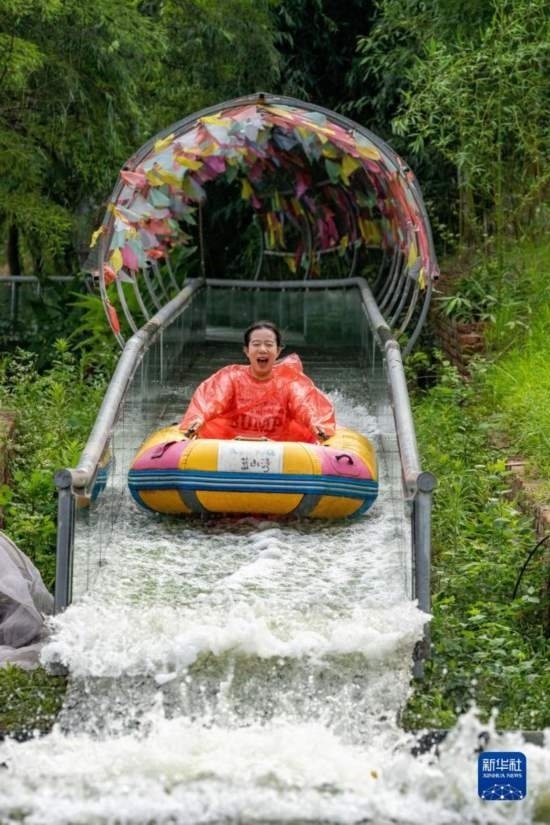 7月8日,小朋友在貴州省鎮(zhèn)遠(yuǎn)縣羊坪鎮(zhèn)一家水上游樂園戲水游玩。