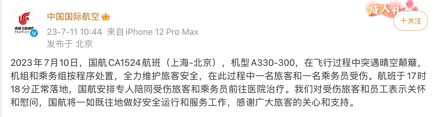 7月11日,中國(guó)國(guó)際航空在其官方微博發(fā)布通報(bào):2023年7月10日,國(guó)航CA1524航班(上海-北京),機(jī)型A330-300,在飛行過(guò)程中突遇晴空顛簸,機(jī)組和乘務(wù)組按程序處置,全力維護(hù)旅客安全,在此過(guò)程中一名旅客和一名乘務(wù)員受傷。航班于17時(shí)18分正常落地,國(guó)航安排專(zhuān)人陪同受傷旅客和乘務(wù)員前往醫(yī)院治療。