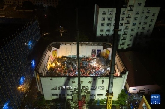 7月24日,消防救援人員在齊齊哈爾市第34中學(xué)體育館樓頂坍塌事故現(xiàn)場救援。新華社記者 張濤 攝