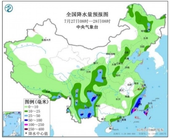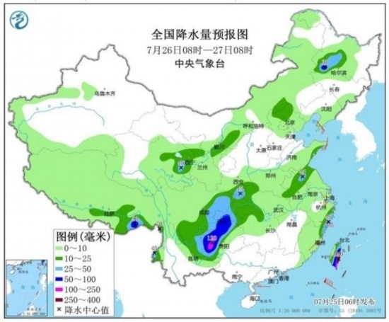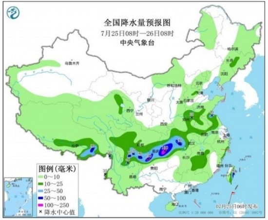 預(yù)計(jì),7月25日08時(shí)至26日08時(shí),重慶中南部、四川南部、云南東北部、貴州北部、湖南西北部、湖北西部以及江蘇北部、西藏東南部、臺(tái)灣島東部等地的部分地區(qū)有大到暴雨,其中,重慶東南部、四川南部、貴州北部等地局地有大暴雨(100~150毫米)(見(jiàn)圖1);上述部分地區(qū)伴有短時(shí)強(qiáng)降水(最大小時(shí)降雨量20~50毫米,局地可超過(guò)70毫米),局地有雷暴大風(fēng)等強(qiáng)對(duì)流天氣。中央氣象臺(tái)7月25日06時(shí)繼續(xù)發(fā)布暴雨藍(lán)色預(yù)警。