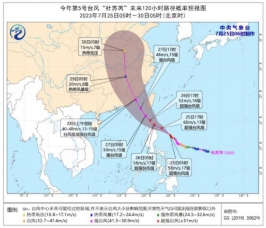 圖2 臺(tái)風(fēng)“杜蘇芮”未來(lái)120小時(shí)路徑概率預(yù)報(bào)圖(7月25日05時(shí)-30日05時(shí))