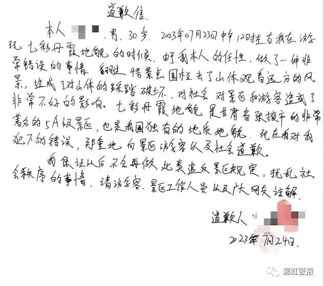 同時,張掖丹霞大景區(qū)管理委員會(張掖國家地質(zhì)公園管理局)微信公眾號還發(fā)布了這名游客的道歉信。該游客稱“由于本人的任性,做了一件非常錯誤的事情,翻過4號景點圍欄去了山體觀看遠方的風景,造成了對山體的踩踏破壞,對社會、對景區(qū)和游客造成了非常不好的影響?!?/p>