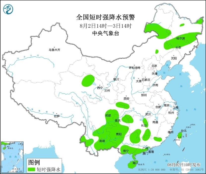 預計8月2日14時至3日14時,內(nèi)蒙古東南部和中部、黑龍江東南部、吉林中西部、遼寧西北部、河北北部、臺灣島北部等地的部分地區(qū)將有8-10級雷暴大風或冰雹天氣;內(nèi)蒙古東部、黑龍江東部和南部、吉林中西部、青海北部、陜西南部、湖南東部和西部、四川東部和南部、重慶西部和東南部、貴州大部、云南東部和西部、廣西南部和西部、廣東北部和西南部、海南島、臺灣島北部等地的部分地區(qū)將有短時強降水天氣,小時雨量30-50毫米,局地可達60毫米以上。