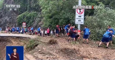 8月2日上午,現(xiàn)場總指揮決定護送自愿離開的被困群眾進行撤離。在撤離的隊伍中,有38名來自新疆參加北京游學(xué)的孩子,他們最小的6歲,平均年齡也只有8歲。為了保障轉(zhuǎn)移時的安全,撤離線路選擇了相對安全的盤山公路進行。途中經(jīng)過落石塌方險區(qū)的時候,消防員們依次排開,在斷崖旁形成人墻,用身體筑起一條防線。遇到水流,消防員們把孩子們抱著傳遞到安全位置再繼續(xù)前行。