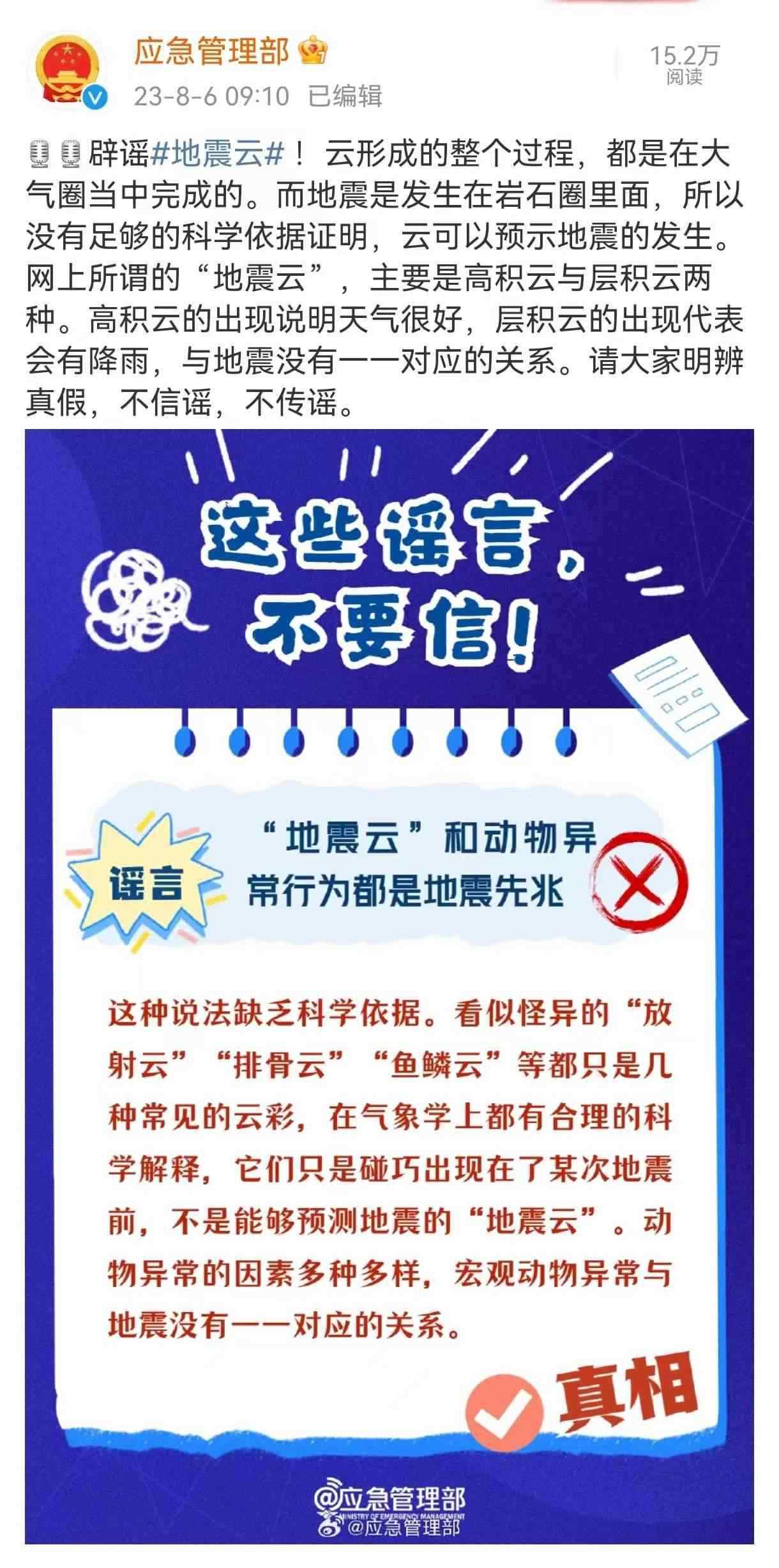 人民網(wǎng)北京8月6日電 (周靜圓)據(jù)中國地震臺網(wǎng)正式測定:8月6日2時33分在山東省德州市平原縣發(fā)生5.5級地震,震源深度10千米。地震發(fā)生后,有網(wǎng)友曬出自己拍下的云層,有關(guān)“地震云能預(yù)測地震”的說法在網(wǎng)絡(luò)上廣泛傳播。8月6日,應(yīng)急管理部官方微博就所謂“地震云”相關(guān)說法進行辟謠。