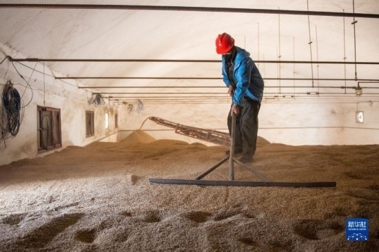 8月7日,在湖南安仁國(guó)家糧食儲(chǔ)備庫(kù)糧倉(cāng),工作人員在平整糧面。
