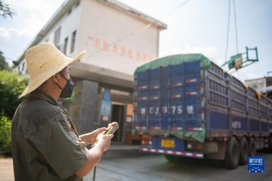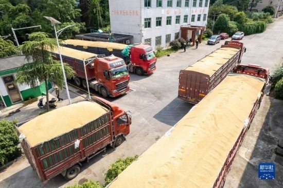 8月7日,運(yùn)糧車在湖南安仁國(guó)家糧食儲(chǔ)備庫(kù)排隊(duì)過(guò)磅(無(wú)人機(jī)照片)。