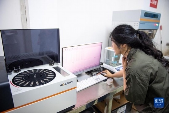 8月7日,在湖南安仁國(guó)家糧食儲(chǔ)備庫(kù)檢測(cè)中心,工作人員操作食品重金屬快速檢測(cè)儀抽檢入庫(kù)糧食的重金屬含量。
