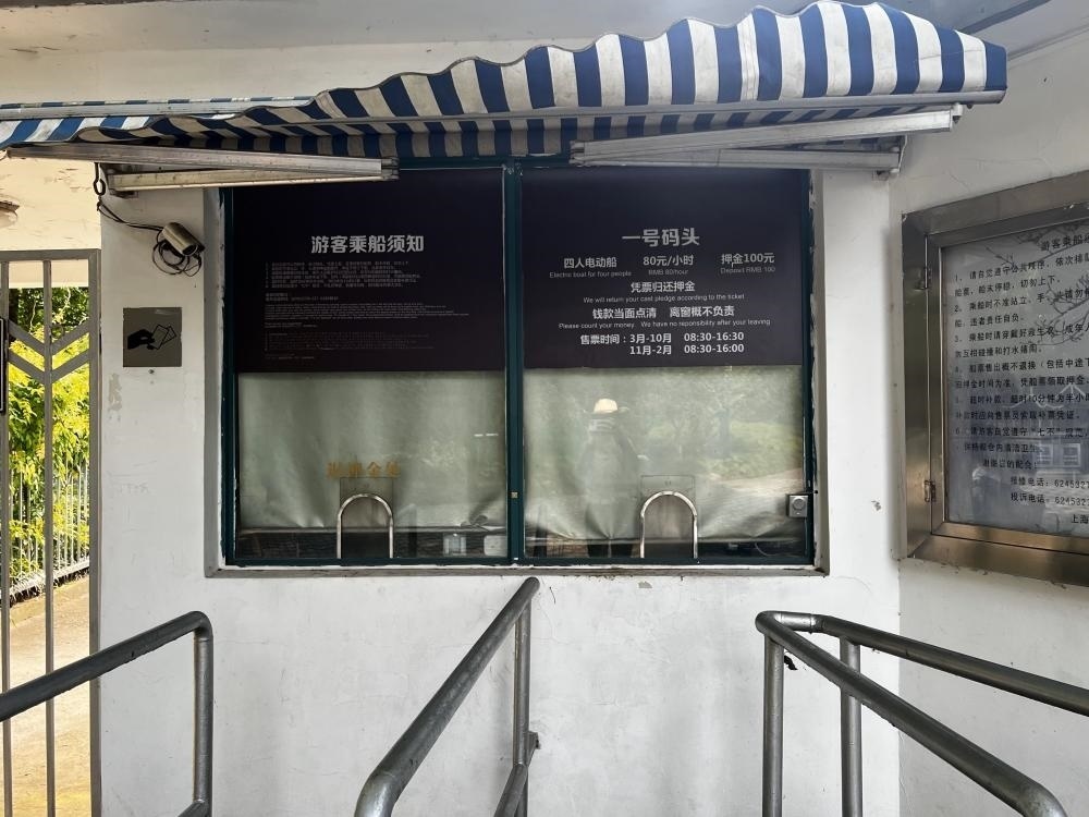 當記者問起是否有現(xiàn)金購買渠道時,工作人員指路了附近的人工售票窗口,同時補充道:“收受現(xiàn)金的售票員有時會離開崗位,不久會回來?!庇浾咴诖说赝A袅艘恍r,注意到長風公園內(nèi)類似的售票窗口有兩個,營業(yè)至16:30。然而,整整一個小時內(nèi),兩個窗口均無人在崗。
