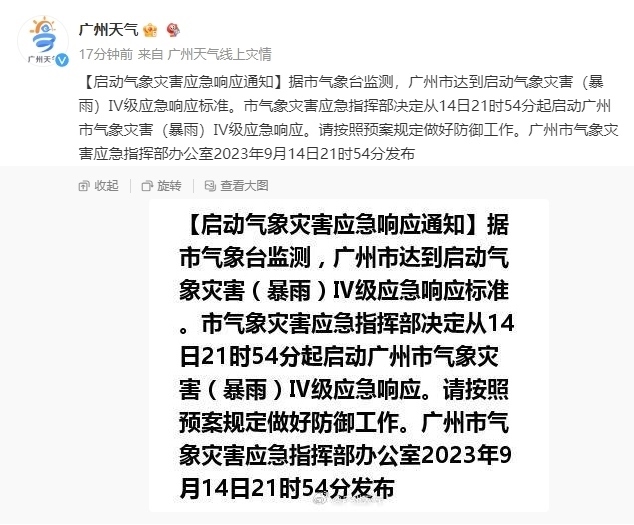 廣州市啟動氣象災(zāi)害(暴雨)Ⅳ級應(yīng)急響應(yīng) 據(jù)@廣州天氣 微博,據(jù)市氣象臺監(jiān)測,廣州市達到啟動氣......