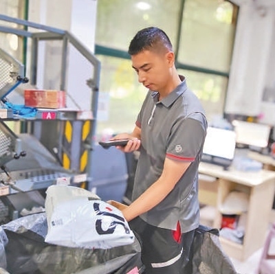 午后,湖北順豐速運(yùn)有限公司武漢唐家墩網(wǎng)點(diǎn),張?jiān):屯聜兪炀毜貙⒋笮〔灰坏目爝f件分類,裝入不同的袋子中。每裝滿一個(gè)編織袋,張?jiān)>驮诖谙路劫N上二維碼,再用機(jī)器掃描登記,確認(rèn)無(wú)誤后裝車發(fā)運(yùn)。
