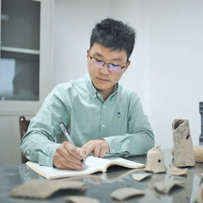 許丹陽在整理記錄出土陶器。受訪者供圖