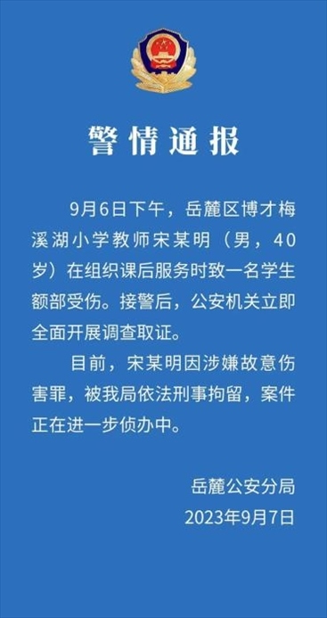 ·長沙岳麓警方:打傷學生老師涉嫌故意傷害罪被刑拘。此前,長沙岳麓區(qū)教育局通報:該校黨總支書記和涉事教師停職。
