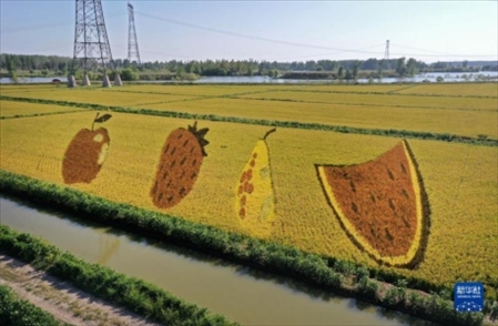 初秋時(shí)節(jié),遼寧省鞍山市臺(tái)安縣遼河文化旅游景區(qū)的稻田畫吸引不少游客前來(lái)參觀游覽。由多種顏色組成的巨型稻田畫勾勒出豐收壯美景象。