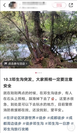 有游客介紹,鄧生溝非常漂亮,不少人前往都會打卡拍照,但不建議靠近水邊,因為水流湍急,且非常冰冷。近期,除了該女游客溺水身亡,還有游客走失,所幸被尋回。