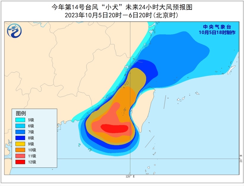 大風預報:5日20時至6日20時,東海大部及釣魚島附近海域、巴士海峽西北部、臺灣海峽、南海東北部以及浙江沿海、福建沿海、廣東東部沿海、臺灣島北部沿海將有6-8級、陣風9-10級的大風,其中巴士海峽西北部、臺灣海峽、南海東北部等地部分海域?qū)⒂?-10級、陣風11-13級的大風,“小犬”中心經(jīng)過的附近海面風力有11-13級,陣風14-15級。