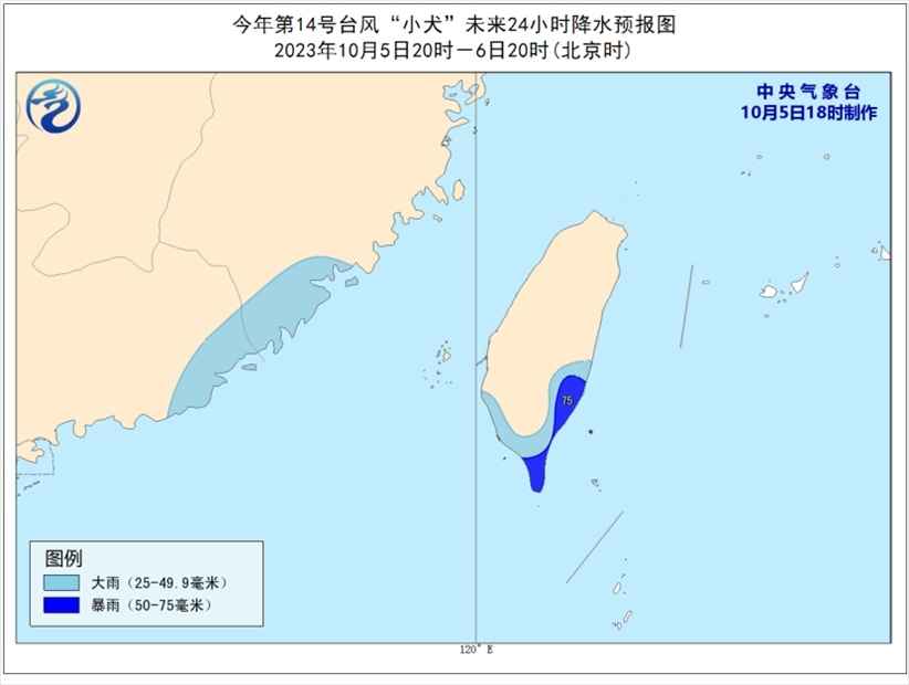 降水預報:5日20時至6日20時,臺灣島南部、福建東南部、廣東東北部等地將有大雨或暴雨(50-75毫米)。