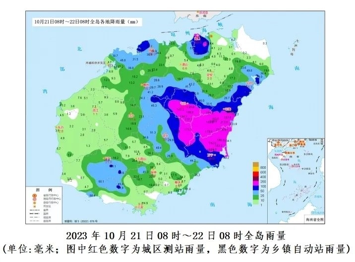 預(yù)計,10月22日08時~25日08時各地累積雨量:文昌、瓊海、瓊中、屯昌和萬寧200~300毫米、局地450毫米,???、澄邁、定安、保亭、陵水和三亞100~180毫米,其余市縣50~80毫米。
