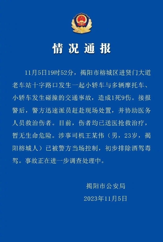 ·廣東揭陽(yáng)發(fā)生多車碰撞事故,致1死9傷,涉事司機(jī)被當(dāng)場(chǎng)控制。