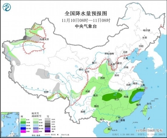11月10日08時(shí)至11日08時(shí),新疆沿天山地區(qū)和南疆西部山區(qū)、山西中部等地部分地區(qū)有小到中雪或雨夾雪,局地大雪。西北地區(qū)東南部、江漢西部、江南、西南地區(qū)東部、華南、臺(tái)灣島等地部分地區(qū)有小到中雨,其中,浙江中南部、福建北部等地部分地區(qū)有大雨。遼東半島、山東南部等地部分地區(qū)有4~5級(jí)風(fēng)(見圖4)。