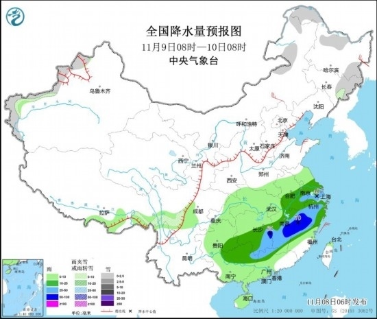 圖2 全國(guó)降水量預(yù)報(bào)圖(11月8日08時(shí)-9日08時(shí)) 圖片來(lái)源:中央氣象臺(tái)網(wǎng)站