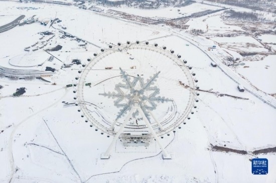 這是11月9日拍攝的位于哈爾濱冰雪大世界園區(qū)內(nèi)的雪花摩天輪(無人機(jī)照片)。