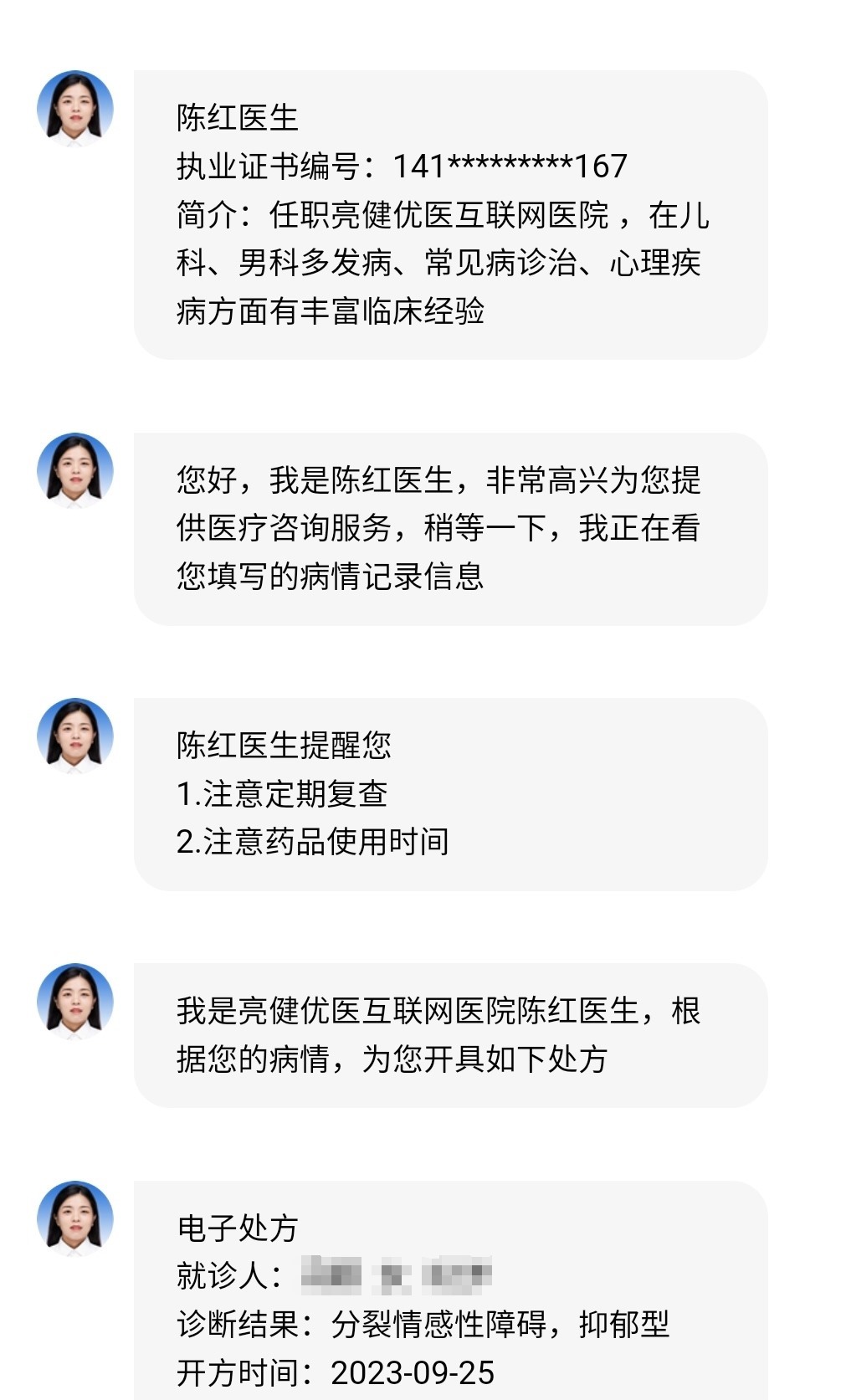 不僅是問診環(huán)節(jié)存在問題,開處方環(huán)節(jié)也有漏洞。記者發(fā)現(xiàn),一家名為“亮健好藥網(wǎng)”的企業(yè),在銷售抗抑郁類藥物“米氮平”“百憂解”等藥物時(shí),其他平臺(tái)都需要上傳處方照片進(jìn)行審核,而記者多次上傳不同樣式的風(fēng)景照,每次都會(huì)跳出來一位“亮健優(yōu)醫(yī)互聯(lián)網(wǎng)醫(yī)院陳紅醫(yī)生”接診,根據(jù)介紹,她在兒科、男科多發(fā)病、常見病診治、心理疾病方面有豐富臨床經(jīng)驗(yàn)。根據(jù)記者上傳的風(fēng)景照,陳醫(yī)生瞬間開具了電子處方,并進(jìn)入了藥師審核階段。隨后記者取消訂單,并在不同時(shí)間,多次嘗試上傳風(fēng)景照,發(fā)現(xiàn)每次都是這位陳紅醫(yī)生瞬間開方。雖然后續(xù)亮健平臺(tái)藥師都會(huì)致電記者要求補(bǔ)充處方才能開藥,但這位陳紅醫(yī)生卻總能第一時(shí)間看著風(fēng)景照“秒開處方”。