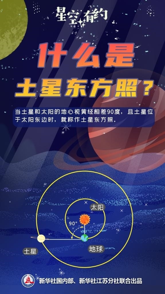 當(dāng)土星和太陽的地心視黃經(jīng)相差90度,且土星位于太陽東邊時(shí),就稱作土星東方照。如果可以俯視太陽系的平面,此時(shí)你會(huì)看到太陽、地球、土星形成了一個(gè)直角,地球處于直角的頂點(diǎn)。