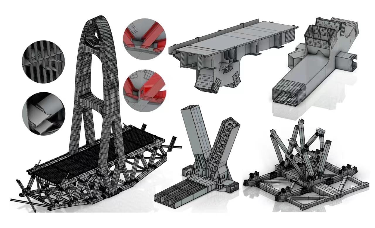 “本橋曲線鋼桁梁構(gòu)造異常復(fù)雜,鋼塔外形為半橢圓變截面,桁架近萬(wàn)根桿件空間定位要求嚴(yán)絲合縫。為了準(zhǔn)確表達(dá)每個(gè)細(xì)節(jié),我們采用了BIM正向設(shè)計(jì)思路,探索出設(shè)計(jì)—建模—成圖一體化的設(shè)計(jì)流程,開發(fā)出自動(dòng)化建模功能和智能化出圖系統(tǒng),為施工企業(yè)和鋼梁制造廠提供高精度的模型和批量圖紙,精準(zhǔn)表達(dá)復(fù)雜的結(jié)構(gòu)信息和設(shè)計(jì)意圖,打通了設(shè)計(jì)—制造—施工全過(guò)程信息傳遞路徑,有效節(jié)約了工期與造價(jià)?!敝需F設(shè)計(jì)集團(tuán)大橋項(xiàng)目主管總工彭嵐平向我們講述了大橋采用的最新智能化設(shè)計(jì)手段。