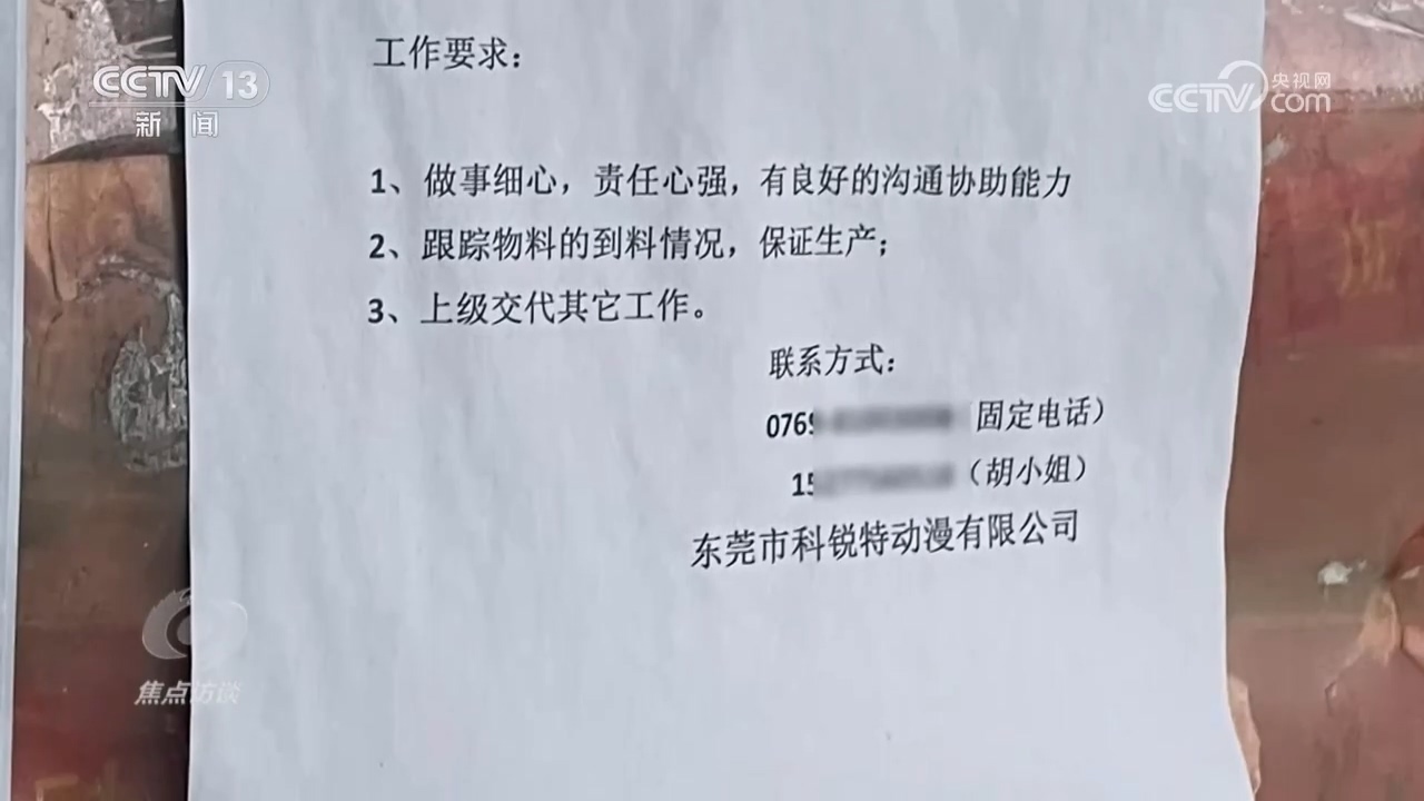 隨后,記者在佳輝公司的門口看到了幾張招工啟示,其中一張的招工單位落款正是科銳特公司,看來,兩家公司必定有所關(guān)聯(lián)。于是,記者想辦法再次進入到了“佳輝”的生產(chǎn)車間,發(fā)現(xiàn)工人們正在生產(chǎn)所謂的“美少女”手辦的組合部件。