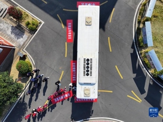 12月1日,在長(zhǎng)沙市望城區(qū)新河學(xué)校,學(xué)生參加汽車盲區(qū)體驗(yàn)活動(dòng)(無(wú)人機(jī)照片)。