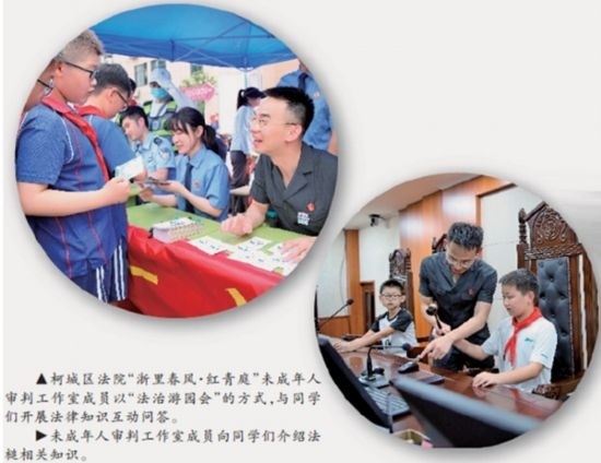 “‘紅青庭’品牌Logo中,‘紅’字既突出黨建統(tǒng)領(lǐng)又寓意紅領(lǐng)巾,是百折不撓的精神象征;‘青’字代表著青少年,是肩負未來的青春力量;‘庭’字則是指少年法庭和家庭?!焙l(wèi)民介紹,柯城區(qū)法院依托“浙里春風·紅青庭”品牌,成立青少年法治教育實踐基地和未成年人審判工作室,積極開展內(nèi)外聯(lián)動,在持續(xù)加強涉未成年人刑事、民事、行政審判融合的基礎(chǔ)上,不斷深化與公安、檢察、教育、團委、婦聯(lián)等部門的協(xié)調(diào)配合,構(gòu)筑全方位、多鏈條的綜合司法保護機制。