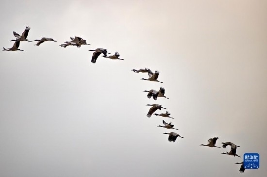 這是12月5日清晨在拉薩市林周縣虎頭山水庫(kù)拍攝的越冬黑頸鶴。