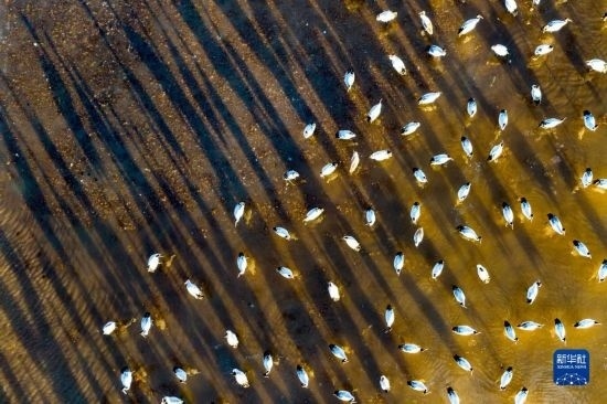 這是12月5日清晨在拉薩市林周縣虎頭山水庫(kù)拍攝的越冬黑頸鶴(無(wú)人機(jī)照片)。
