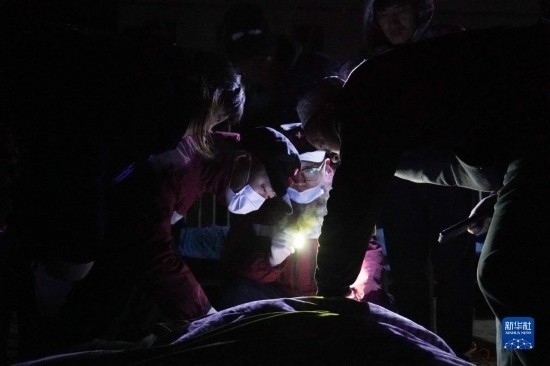 12月19日,在甘肅省臨夏回族自治州積石山保安族東鄉(xiāng)族撒拉族自治縣中西醫(yī)結(jié)合醫(yī)院門口,醫(yī)務(wù)工作者查看傷者情況。
