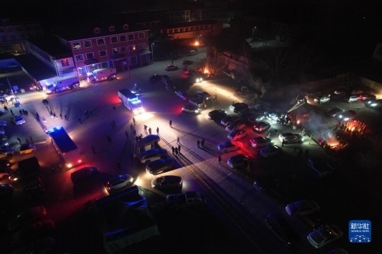 12月19日,在甘肅省臨夏回族自治州積石山保安族東鄉(xiāng)族撒拉族自治縣大河家鎮(zhèn)大河村,多方力量開展救援(無人機(jī)照片)。