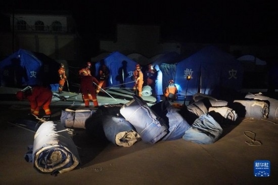 12月19日,在甘肅省臨夏回族自治州積石山保安族東鄉(xiāng)族撒拉族自治縣大河家鎮(zhèn)大河村,消防人員搭建救災(zāi)帳篷。