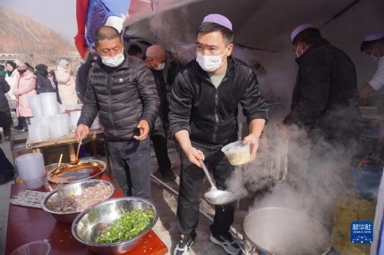 12月19日,在甘肅臨夏積石山縣大河家鎮(zhèn)大河村安置點,蘭州餐飲企業(yè)“筷上癮”為受災(zāi)群眾送來愛心牛肉面。