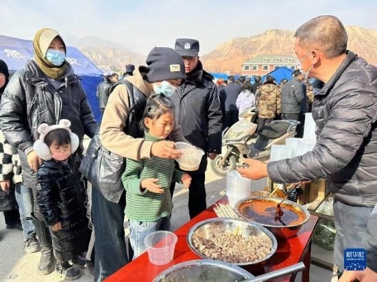 12月19日,在甘肅臨夏積石山縣大河家鎮(zhèn)大河村安置點,受災(zāi)群眾領(lǐng)取愛心牛肉面。