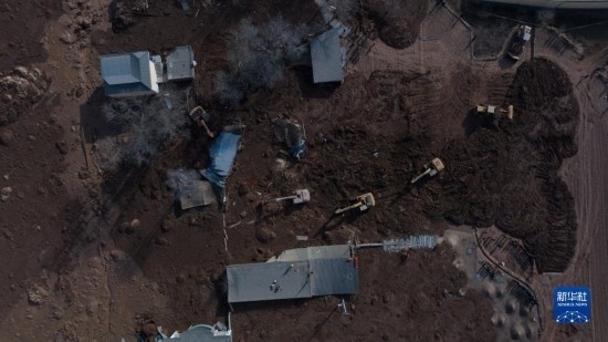 12月19日,救援機(jī)械和人員在青海省海東市民和回族土族自治縣中川鄉(xiāng)金田村清理地震引發(fā)的砂涌(無人機(jī)照片)。