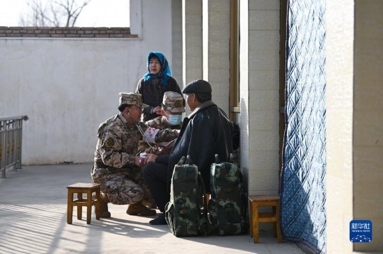 12月19日,武警青海總隊(duì)海東支隊(duì)衛(wèi)生隊(duì)醫(yī)師在青海省海東市民和回族土族自治縣中川鄉(xiāng)草灘村開展醫(yī)療保障。