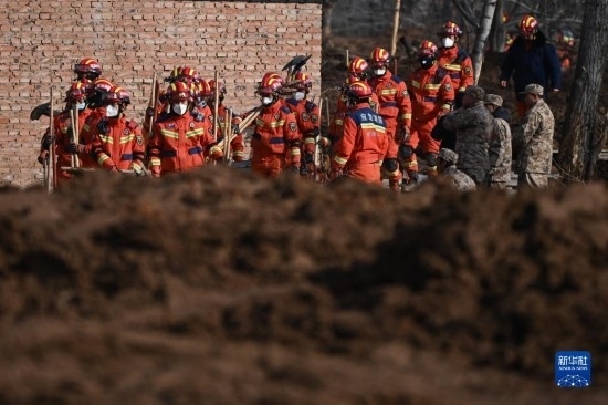 12月19日,救援機(jī)械和人員在青海省海東市民和回族土族自治縣中川鄉(xiāng)金田村清理地震引發(fā)的砂涌。