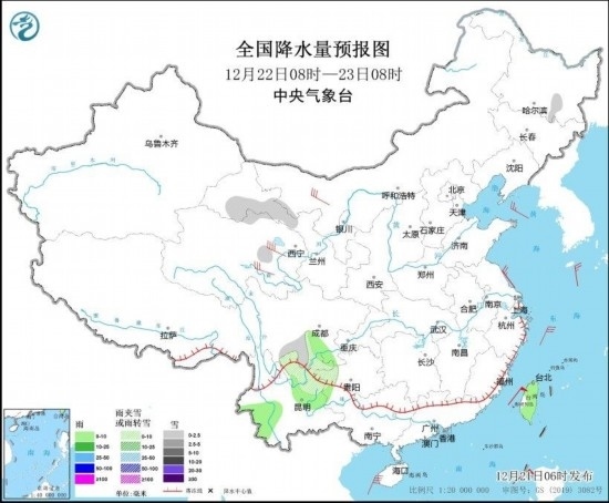 圖4 全國降水量預(yù)報(bào)圖(12月22日08時-23日08時)