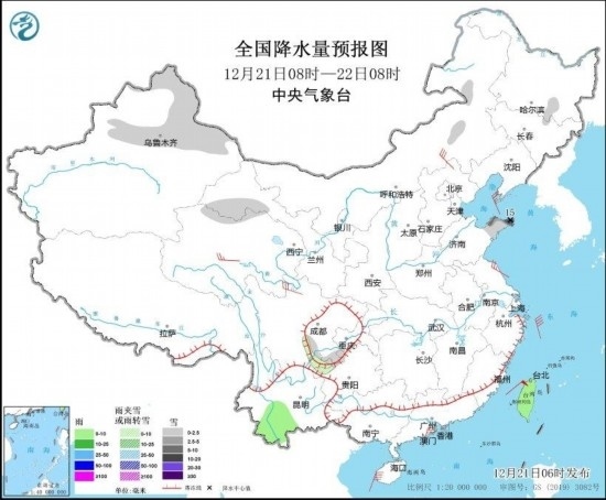 圖3 全國降水量預(yù)報(bào)圖(12月21日08時-22日08時)