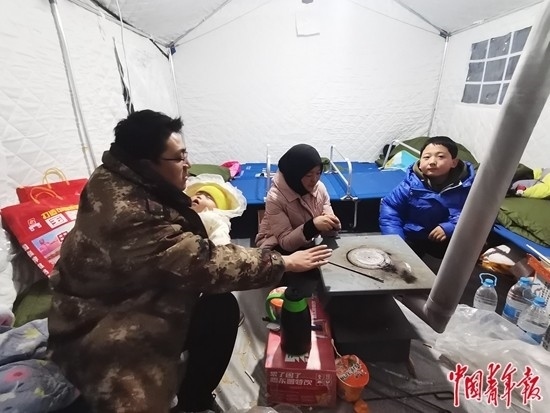 幸運(yùn)的是,李琴?zèng)]有受傷,但家卻回不去了。她只能和村里的多數(shù)人一樣,在玉米地里“湊合了一晚”。第二天,村里發(fā)來(lái)帳篷,還有一箱方便面和火腿腸。物資有限,李琴和親戚兩家9個(gè)人擠一頂帳篷,裹上最厚的棉衣,生了火,但還是冷得發(fā)抖。一到晚上,帳篷內(nèi)壁全掛著冰碴兒,“只能說(shuō)勉強(qiáng)受得住”。