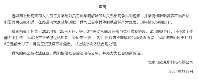 ·女高管違法開除員工?涉事公司發(fā)布情況說明。